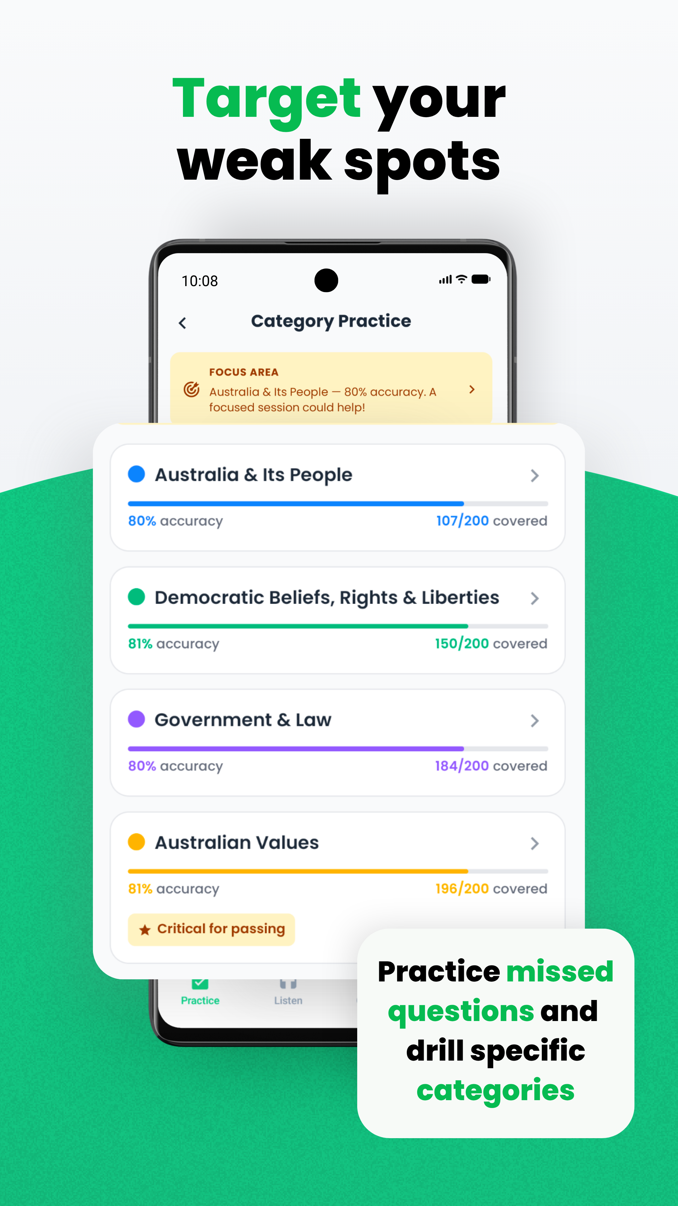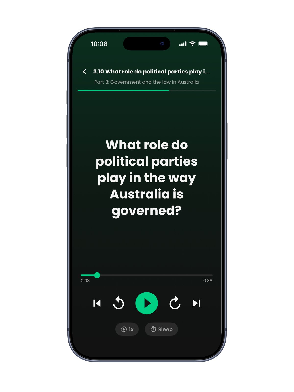 Simulate the real Australian Citizenship Test: 20 questions, a 45-minute timer, and the same dual pass criteria. No surprises. No regrets.